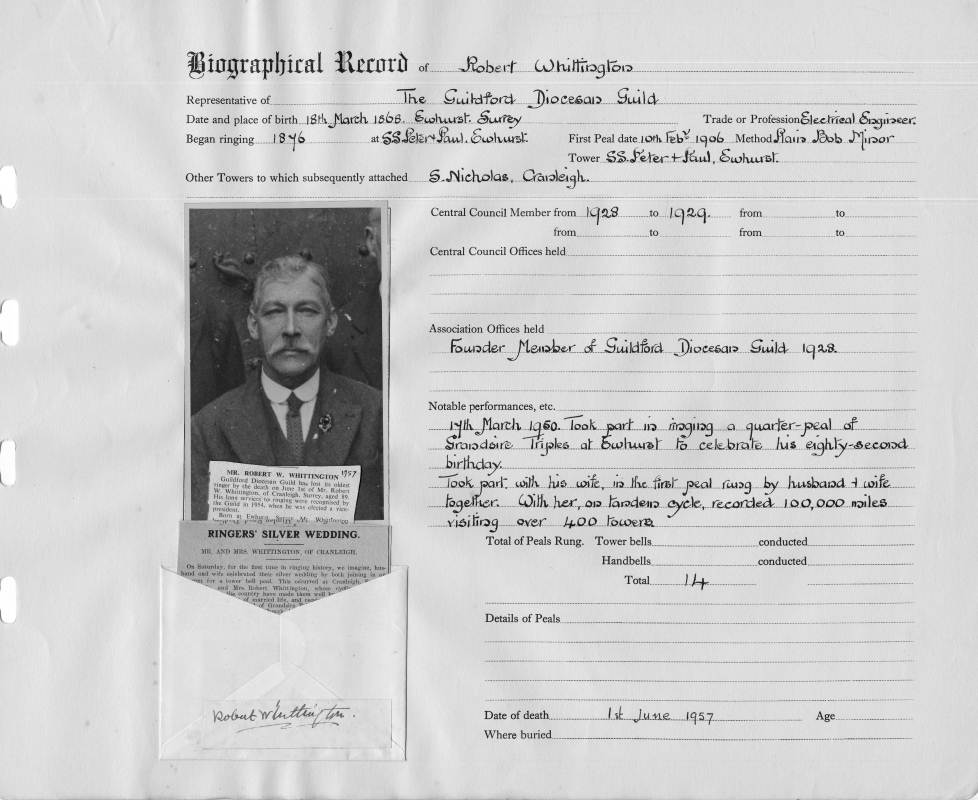Places:Place of Birth: Ewhurst, Surrey Began ringing at: SS. Peter & Paul, Ewhurst Tower from biographical record etc.: St. Nicholas, Cranleigh Tower mentioned in obituary: Cranleigh |
