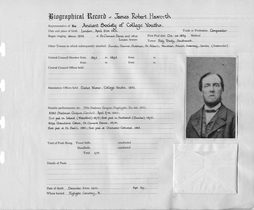 Ringing records:Began ringing: 1836 Notable performances: 7524 Stedman Cinques, Cripplegate, Jan 6th 1851 8580 Stedman Cinques, Cornhill, April 27th 1861; First peal in Ireland (Wateford) 1872; first peal in Scotland (Dundee) 1873; 8099 Grandsire Caters, St. Clement Danes 1878; First peal at St Paul's 1881; first peal at Chichester Cathedral 1885. First peal: Holy Trinity, Southwark 01/10/1839 See who James Robert Haworth rang with Total peals rung: 176 |