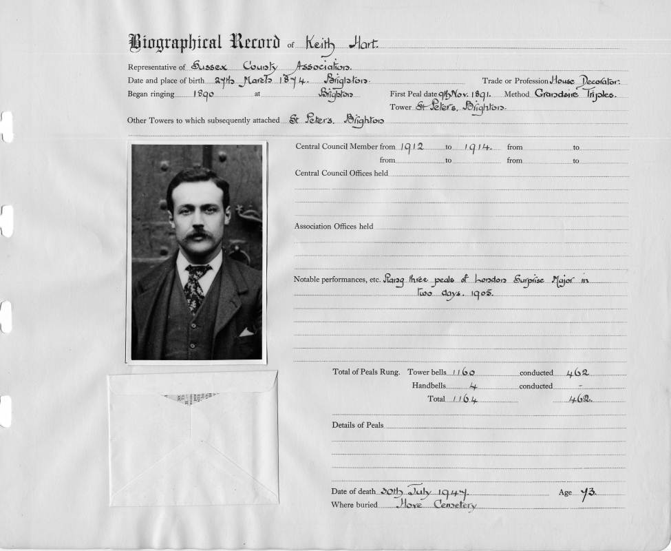Ringing records:Began ringing: 1890 Notable performances: Rang three peals of London Surprise Major in two days, 1905 First peal: Grandsire Triples St. Peter, Brighton 09/11/1891 Date of Thousandth peal: 06/04/1931 Total peals rung: 1164 Total peals conducted: 462 Tower bell peals rung: 1160 Tower bell peals conducted: 462 Handbell peals rung: 4 Handbell peals conducted: 0 |