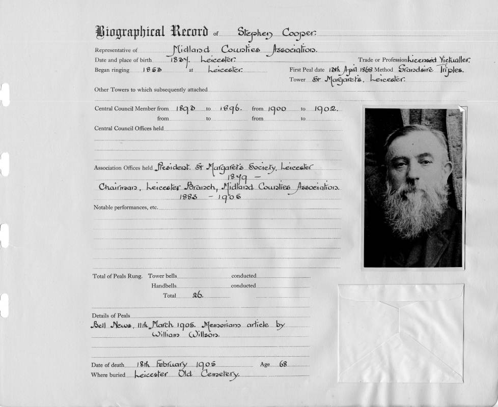Ringing records:Began ringing: 1853 First peal: Grandsire Triples St. Margaret, Leicester 13/04/1868 See who Stephen Cooper rang with Total peals rung: 26 |