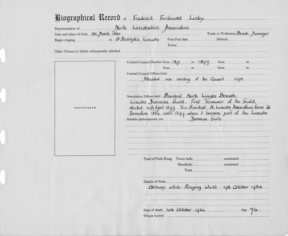 Places:Place of Birth: Began ringing at: St. Botolph's, Lincoln Tower mentioned in obituary: Gainsborough |