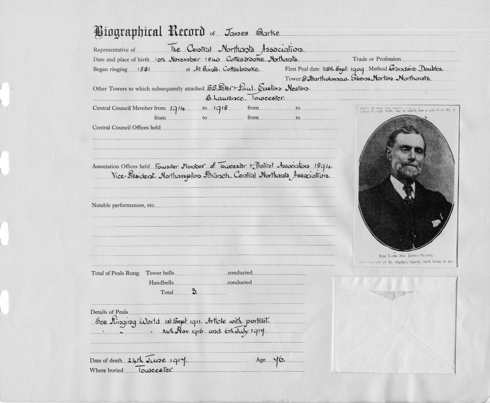 Places:Place of Birth: Cottesbrooke, Northants Began ringing at: All Saint's, Cottesbrooke Tower from biographical record etc.: SS. Peter & Paul, Easton Neston, S. Laurence, Towcester Tower mentioned in obituary: Towcester |