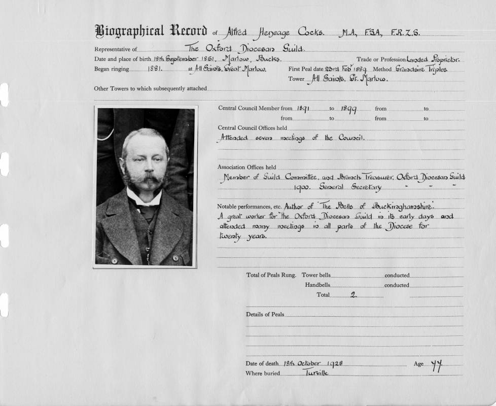Ringing records:Notable performances: Author of 'The Bells of Buckinghamshire.' A great worker for the Oxford Diocesan Guild in its early days and attended many meetings in all parts of the Diocese for twenty years. First peal: Grandsire Triples All Saints, Great Marlow 23/02/1889 Total peals rung: 2 |