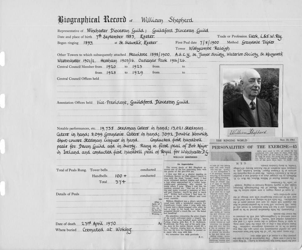 Places:Place of Birth: Exeter Began ringing at: St Sidwell's, Exeter Tower from biographical record etc.: Heavitree 1898/1900. ASCY, St. James' Society, Waterloo Society, St. Margaret's, Westminster 1901/2, Hersham 1903/16, Oatlands Park 1916/26. Tower mentioned in obituary: Chertsey |