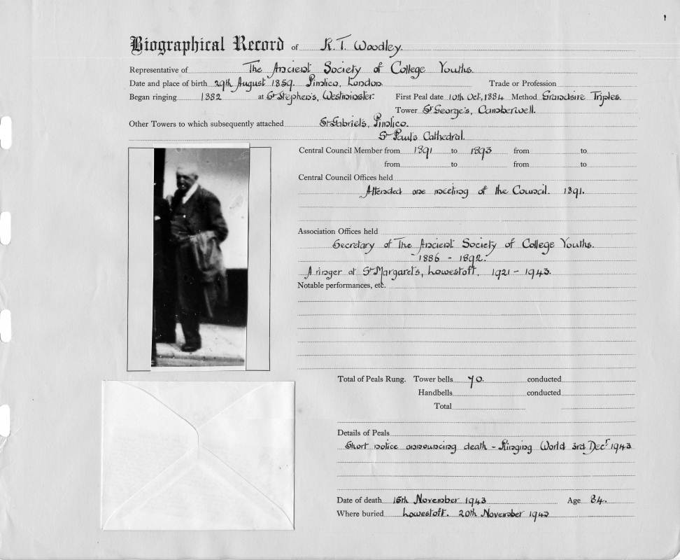 Ringing records:Began ringing: 1882 First peal: Grandsire Triples St. George, Camberwell 10/10/1884 Tower bell peals rung: 70 |